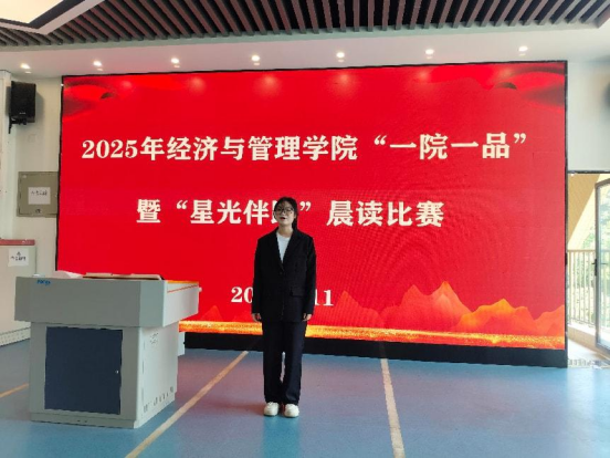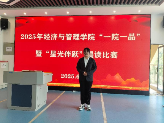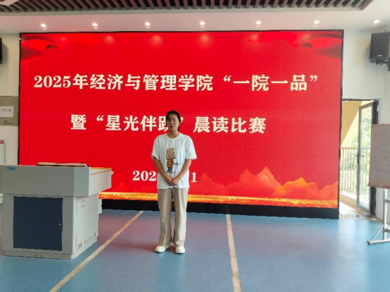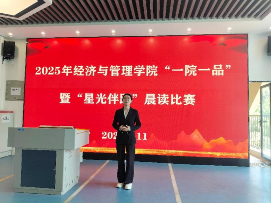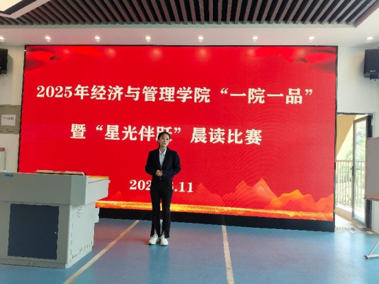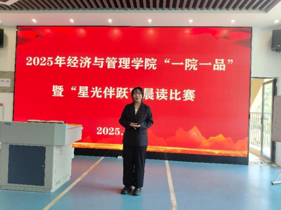 【本网讯】为提升学生语言表达能力与专业知识应用水平,培养良好学习习惯与职业素养,经济与管理学院于2025年6月11日在实验楼C501和C509隆重举办“一院一品”暨“星光伴跃”晨读比赛。比赛分为上、下半场,分别于2025年6月11日12:40和16:10举行,共27位参赛选手依次展示。经济与管理学院院长李清茂、经济与管理学院副院长赖静、财务会计教研室主任谢抒宏、科学工作能力实训教研室主任余涛、辅导员张小威、班导师颜欢担任评委,比赛由张德群主持。