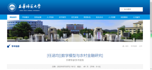 【本网讯】7月7日-8日,由西华师范大学数学与信息学院举办的“2023年数学交叉前沿论坛”在南充举行。学院专任教师任涵均博士受邀参加论坛并做题为“数学模型与农村金融研究”学术报告。