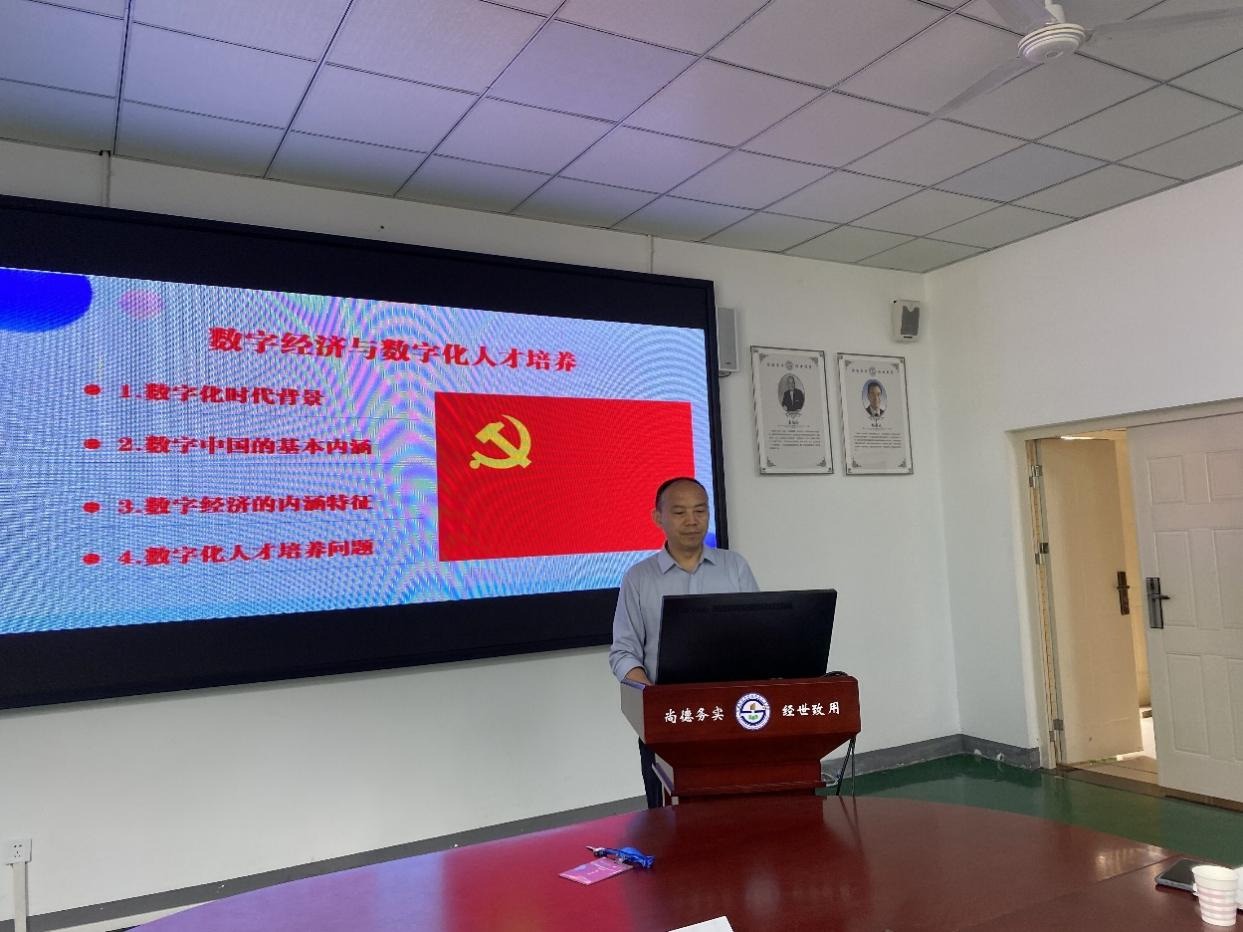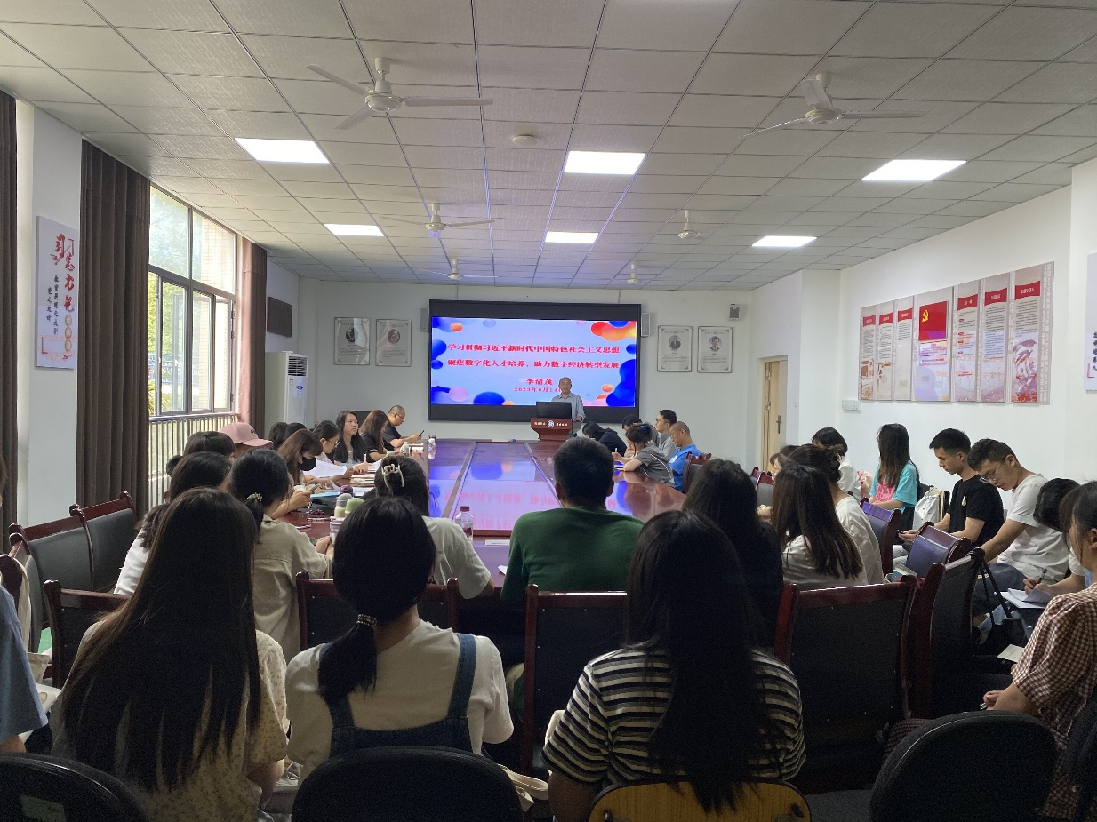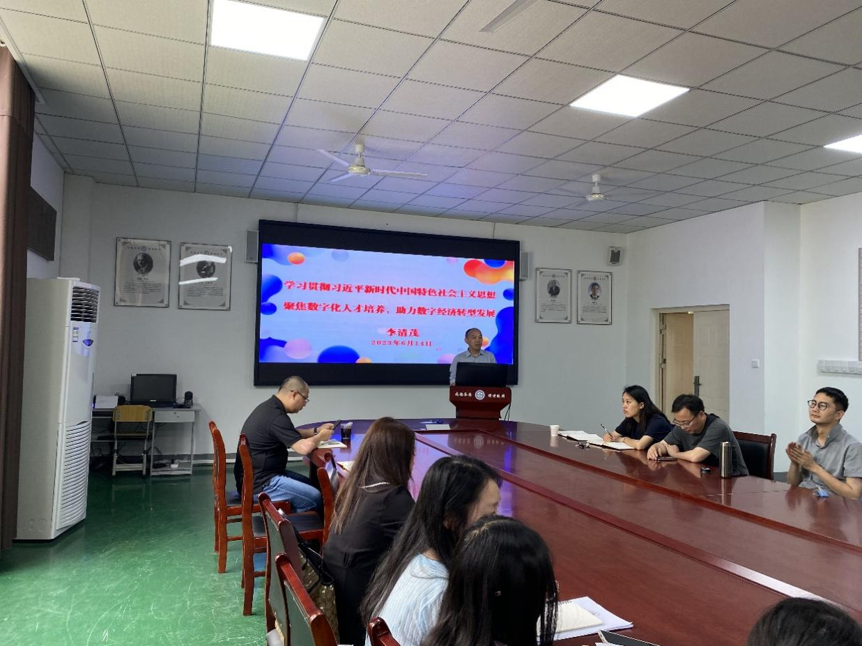 会议开始,李清茂教授以“贯彻习近平新时代中国特色社会主义思想主题教育,聚焦数字化人才培养,助力数字经济转型发展”为主题,围绕四个部分进行了系统解读,一是结合党的二十大报告,阐述了数字化时代背景;二是详细讲解了数字化中国的基本内涵;三是解读了数字经济的内涵特征;四是阐述了如何培养数字化人才。