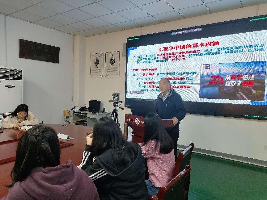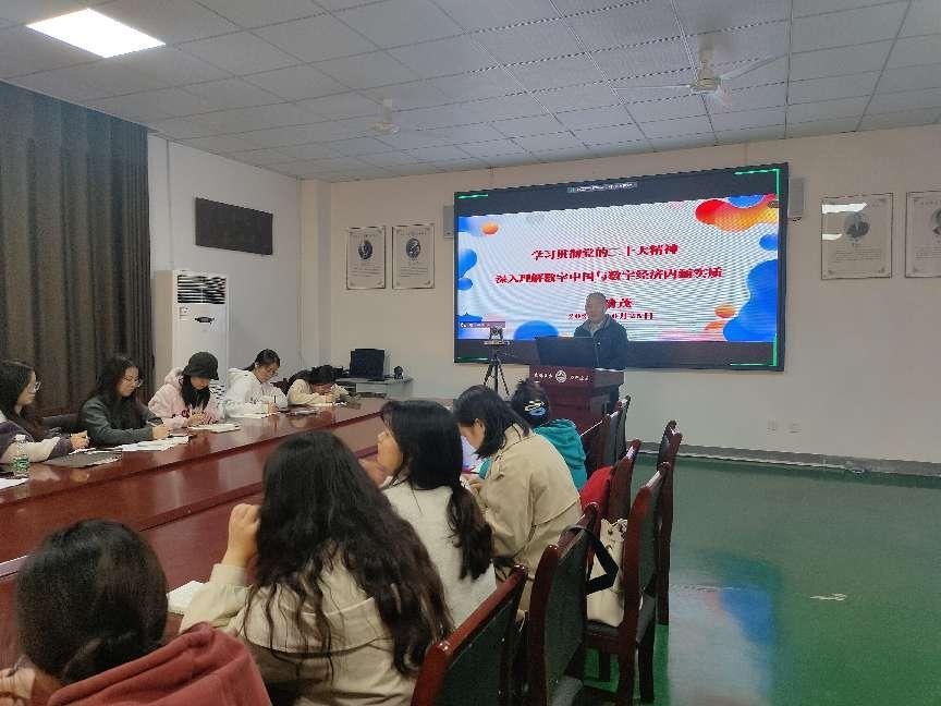 【本网讯】为深入学习贯彻党的二十大精神和深刻领会二十大提出的“到二0三五年,我国发展的总目标”,深刻领悟“建成现代化经济体系,形成新发展格局,基本实现新型工业化、信息化、城镇化、农业现代化”的重要意义,经济与管理学院院长李清茂教授以“学习贯彻党的二十大精神深入理解数字中国与数字经济内涵实质”为题举行专题讲座。讲座于2023年10月25日(星期三)下午14:00,在实验楼C104会议室举行。学院全体党员教师,学生党员、发展对象、入党积极分子参加了此次讲座。