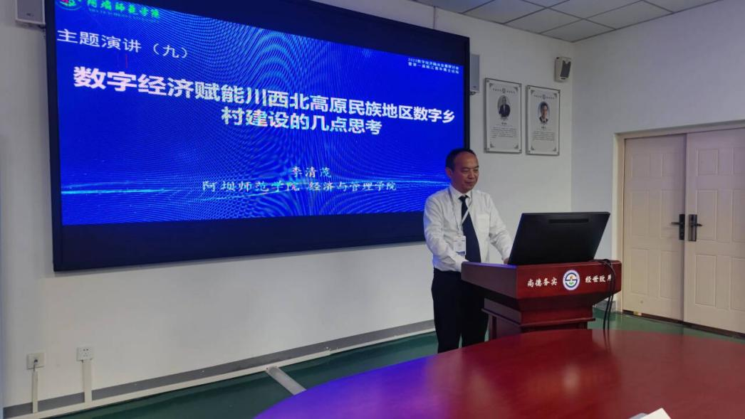李清茂院长以“数字经济赋能川西北高原民族地区数字乡村建设的几点思考”为题作了专题报告。他从数字经济的内涵特征、数字乡村的发展路径、数字经济的学科建设和数字经济的人才培养四个方面,围绕主题进行了精彩分享,他说,我们要从党的二十大报告去理解国家战略需求,从服务阿坝州地方经济社会发展的现实需求,回应国家战略,聚焦阿坝州,开展课题研究;要从“百年未有之大变局”的革命性力量的角度来理解数字经济,从能从更高的站位理解学科建设的价值和意义。