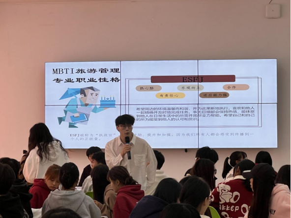 首先是认识自我性格的优势与不足,不断尝试和突破,其次是思考个人性格是否适合这个职业并选择与个人性格相符的职业,并且向我们展示MBTI中的四个维度,每个维度由相反的两极构成,分别是1能量倾向、 2获取信息、 3个体决策、 4生活方式,用MBTI让学生们“预”见自己。讲解过程中邓世刚还运用MBTI软件测试旅游管理专业职业性格,同时向同学们提出以下三个问题;1你的性格特点是什么?2你最理想的职业是什么?3你测试的性格特点是什么?在讲座后期,邓世刚学长通过小游戏“画手掌”让学生们分享自己人生最重要的五件事。