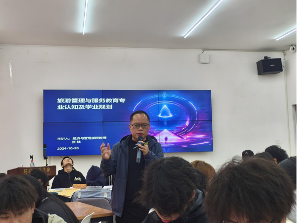 张林教授主要介绍阿坝师范学院基本情况和旅游管理与服务教育专业就业方向。张林教授提出关于旅游专业的学习我们应该“干什么”、“做什么”、“怎么做”,进而从这三个问题展开讨论。启发同学们思考自己对大学四年的职业规划,并从五个方面展开分析,让每一位同学更能明确自己的目标,并投入到计划之中。张林教授讲到:旅游归属于管理类,旅游管理与服务教育是一门综合性的学科,涉及旅游、管理、服务等多个领域,目的是为国家培养复合人才。其次讲到旅游具备的四个特点:综合性,跨学科性,实践性,创新性。四个特点之中最有优势的就是“跨学科性”,它恰巧符合时代对复合型人才的需求。最后,张教授对提出的旅游市场的需求是什么、旅游的培养方向、培养目标、培养方式及旅游学的基础等方面问题进行讲解,让我们对未来有了更进一步的规划。有理想有追求,正如张林教授所言:“读万卷书,不如行万里路。行万里路,不如阅人无数。”只有在一次次的实践中才能提升自我阅历,朝着自己规划的方向前进。