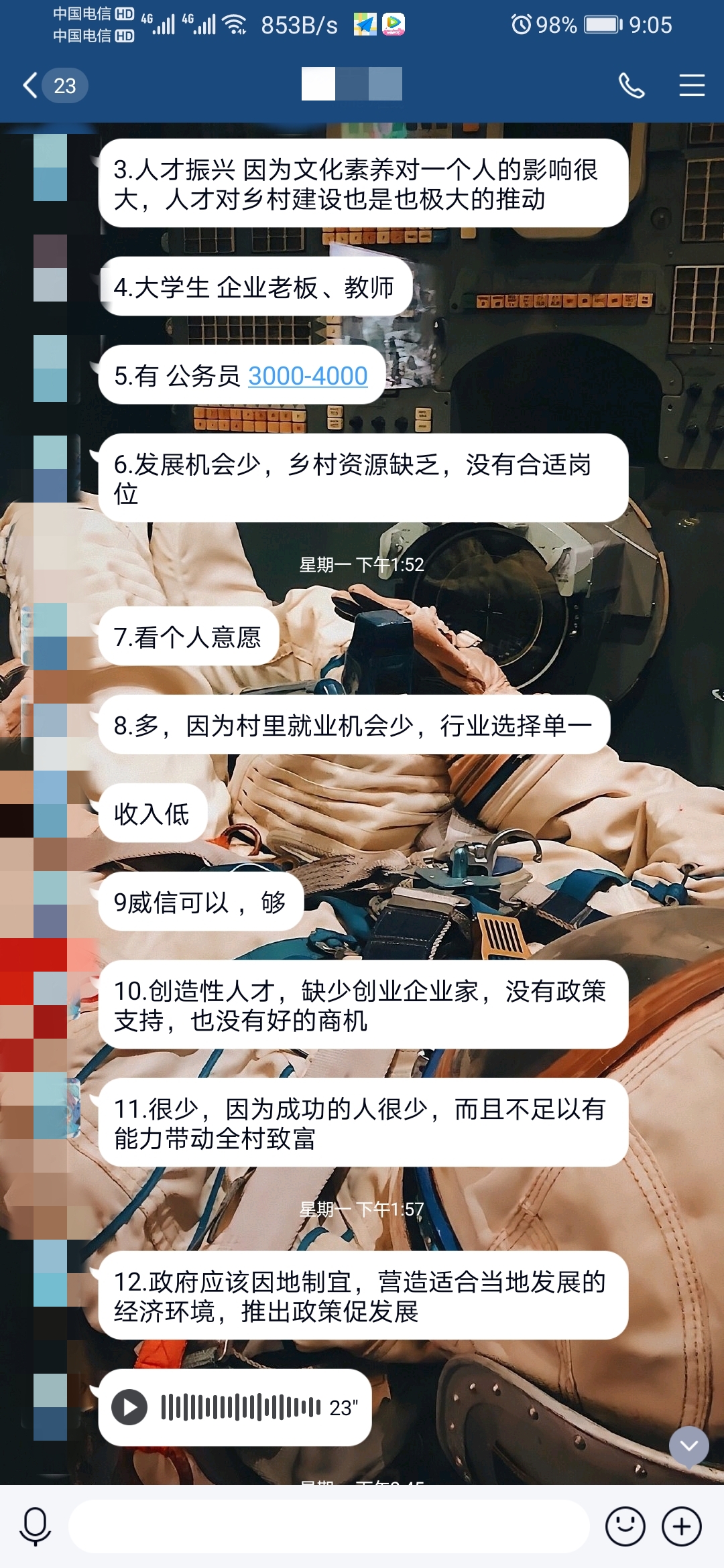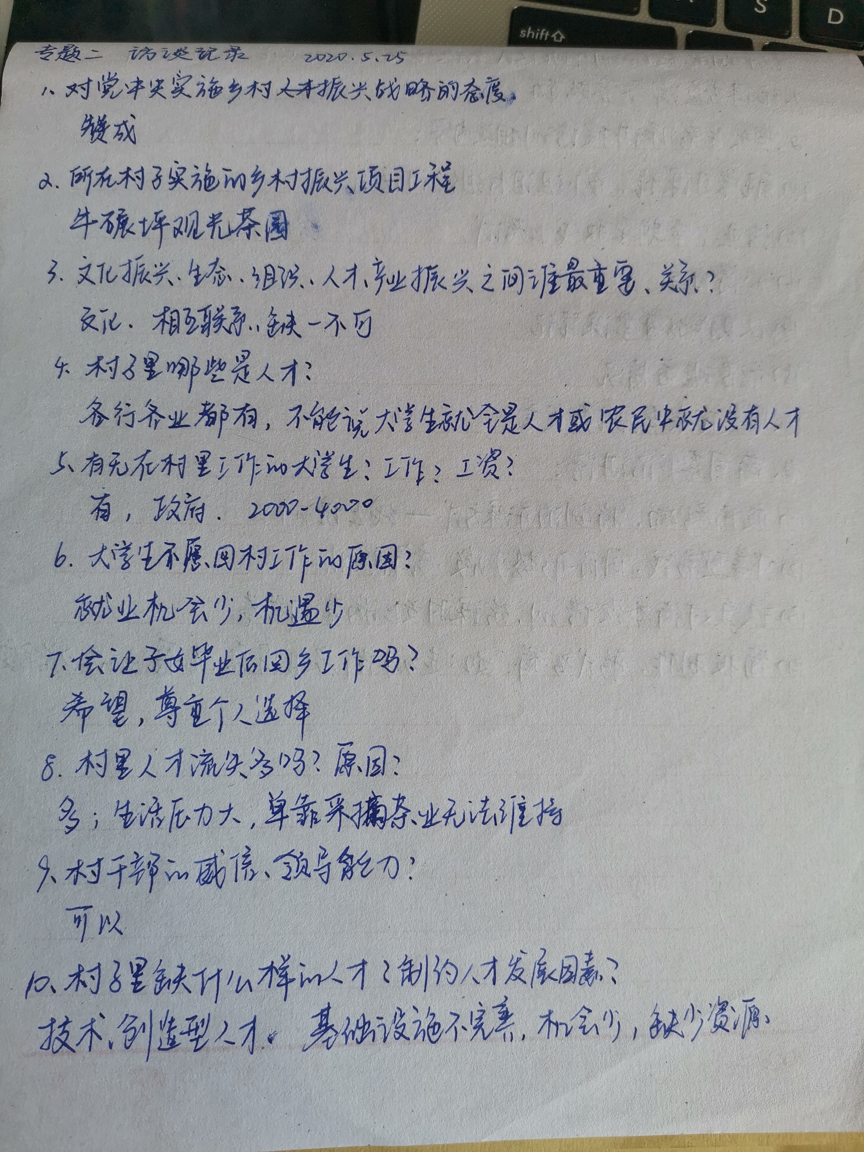 党校培训成员通过面谈、QQ、微信、电话等形式,向乡镇公务员,村干部,普通村民,父母和同学等进行访谈。访谈中,学员就“说说您对党中央实施乡村振兴战略的态度”、“你所在的村子实施乡村振兴的项目工程有哪些?”、“您觉得乡村振兴五个方面,产业振兴,文化振兴,生态振兴,组织振兴和人才振兴之间的关系如何?”、“你觉得所在村子里哪些人能够算得上是人才?”等13个问题进行交流。最后为总结每位成员的访谈结果,每人撰写一份500字左右的实践活动小结。