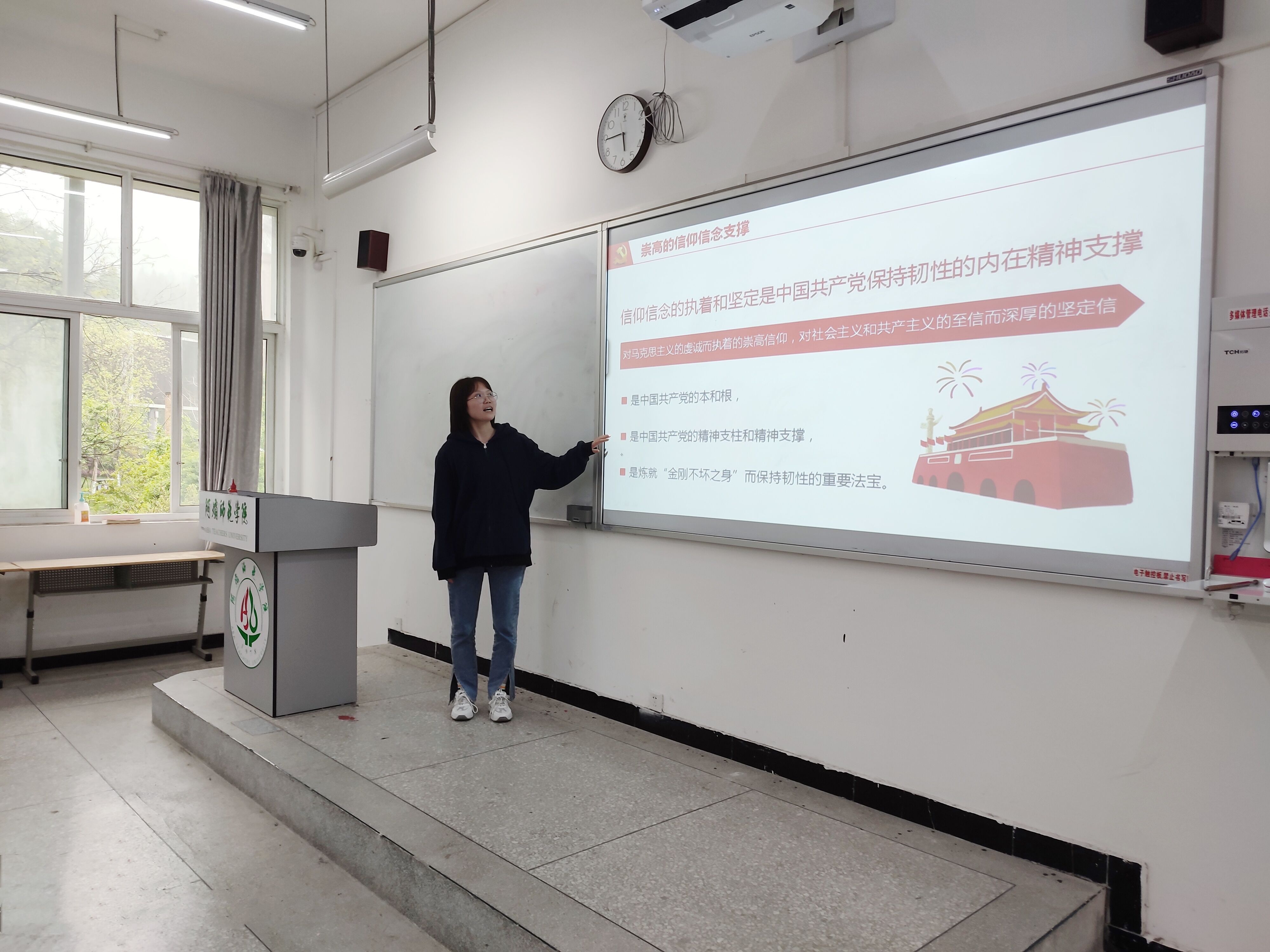 首先,周双同志为大家讲述了何为韧性以及中国共产党的韧性表现在哪里,接着通过对崇高的信仰信念支撑、一以贯之的忧患意识、不断自我革命的勇气、勤于学习善于学习的本领及超强的凝聚人民及社会共识的能力这五个方面的详细阐释,让同学们认识并领悟到中国共产党保持恒久韧性的奥秘所在,体现了中国共产党强大的弹性、抗逆力和复原力。最后,周双同志对以上内容做了深刻的总结,也让同学们学习到中国共产党韧性之内的价值基础、思想基础、组织基础、认同基础与社会基础,展现了中国共产党保持恒久韧性的奥秘与中国共产党全心全意为人民服务的决心。