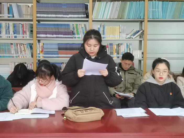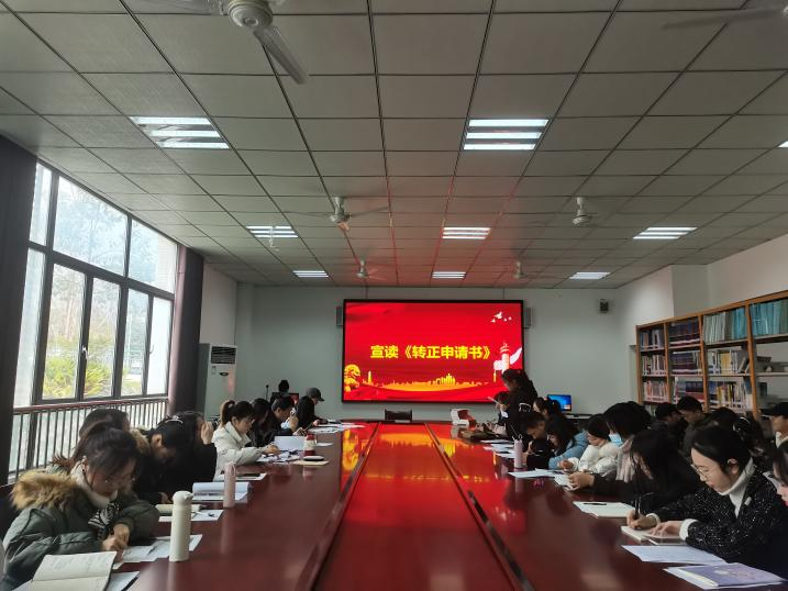 会议进行第二项议程:预备党员鲜雨洛同志、冯婷同志、钟梦雪同志、庹湘同志依次汇报预备期间的思想、工作情况宣读转正申请书;