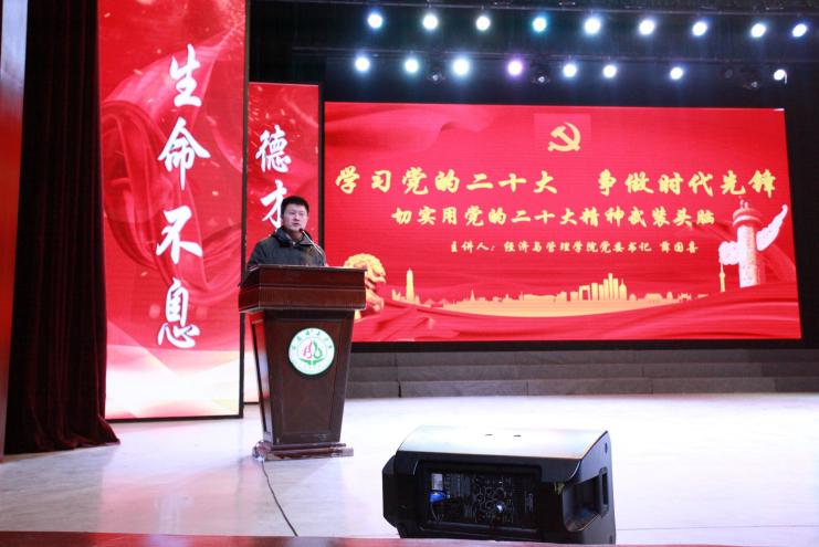 【本网讯】2022年11月30日中午, 经济与管理学院“书记讲党课”活动系列之“学习党的二十大,争做时代先锋”专题党课在南苑剧场隆重举行,本次党课由经济与管理学院党委书记薛国喜同志主讲,经济与管理学院院长李清茂、分团委书记曹茂庭、第二党支部书记马伟龙、年级辅导员次仁次姆应邀出席,我院分团委学生会全体成员、学生干部、入党积极分子等参加了此次大会。