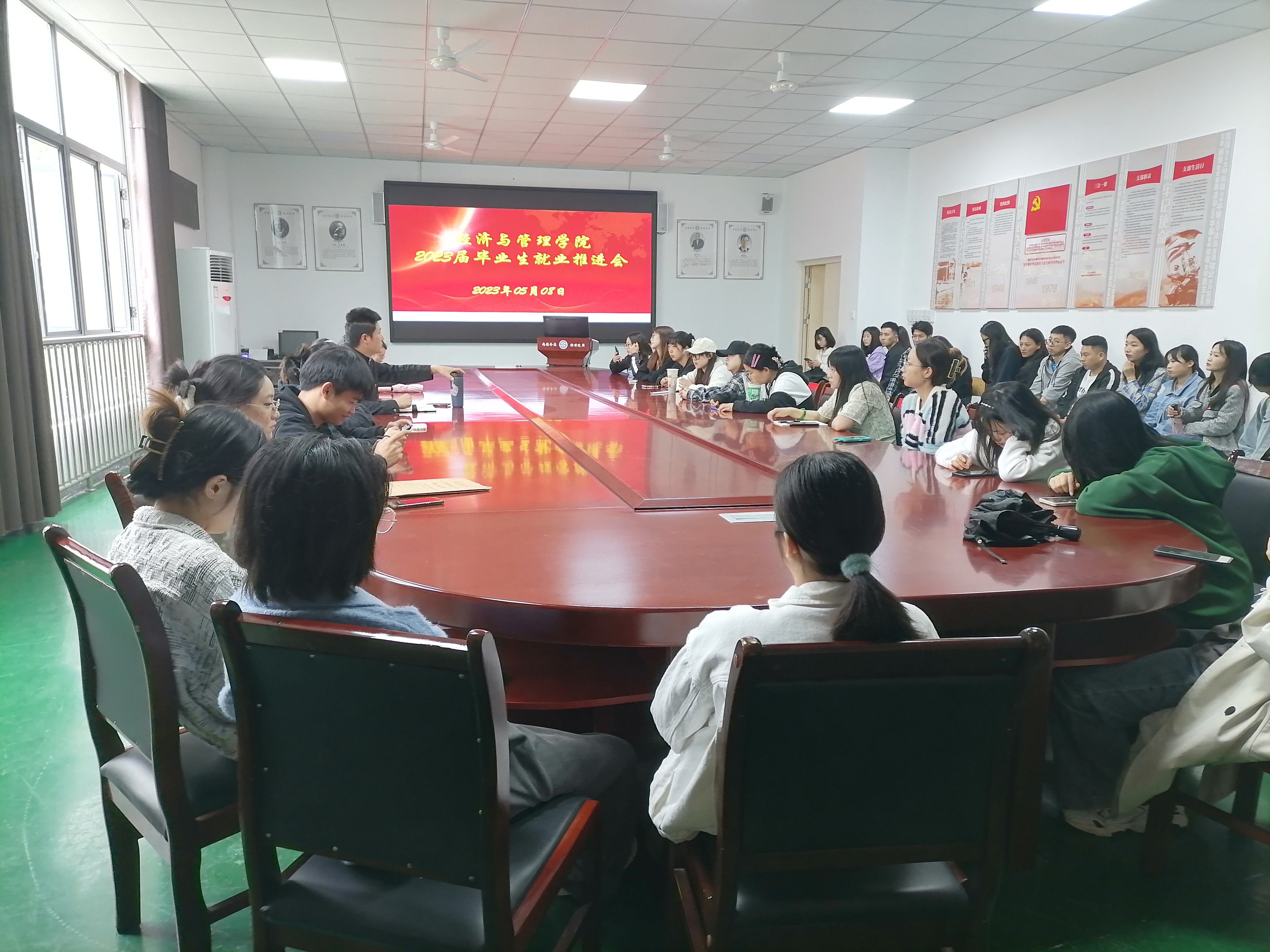 【本网讯】根据学校关于推进2023届毕业生实习和就业工作部署,进一步推进就业工作进程。2023年5月8日下午,经济与管理学院于会议室C104召开2023届毕业生就业推进会议。学院党委书记薛国喜和2023届毕业生出席本次会议。会议由学院党委书记薛国喜同志主持。