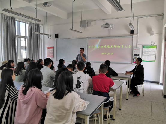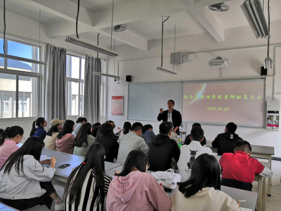 【本网讯】为了加深同学们对考研理解与认识,帮助同学们树立正确人生奋斗目标,增强学生考取研究生的自信心,提升学习竞争力,提高考研成功率,9月25日12:30,经济与管理学院在E401教室召开了2019年考研动员大会。本次动员会不限年级、不限专业,只要是有志考研的同学都可以参加,经管学院党总支副书记薛国喜、副院长李清茂教授、考研负责人张海峰副教授参加了此次动员会,2017级、2018级和2019级有志考研同学参加动员会,会议由张海峰老师主持。