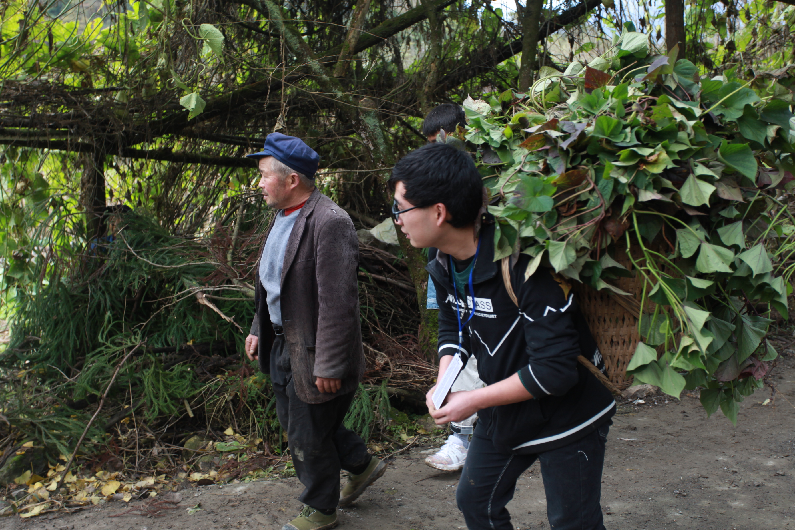 8:00,全体成员在枫叶广场整装待发。全体成员分为四个小组,带着面包和牛奶,手举小红旗,向灯草坪村进发。沿着弯曲且泥泞的山路,大约一个半小时的路程,到达灯草坪村。四个小组沿着不同方向对灯草坪村的住户进行问卷调查,针对每户的实时情况展开不同形式的沟通与交流。在第一小组的调查中,遇见一位在家带孩子的母亲。由于地处偏远,孩子缺乏玩伴,道别时,仍旧依依不舍;在第二小组的调查中,遇见一户五口之家。家中有两位年过七十的老人和一位右手残疾的青年,平日依靠种植作物维持生活;在第三小组的调查中,遇见一对老夫妇。年过七十的老人正在田里收菜,办公室主任杨洪积极热情地帮助老人背菜回家;在第四小组的调查中,遇见一位家庭贫困的空巢老人,我院学子耐心地同老人聊天,给老人带去力所能及的关爱。通过调研发现,村中多为空巢老人,或是子女外出打工留下孙儿相伴。并且村中交通不便,不少居民仍烧柴做饭。部分居民还表示看病困难、国家扶持力度小。但总体表示生活较以前得到很大改善,村中民风朴素,邻里和睦。