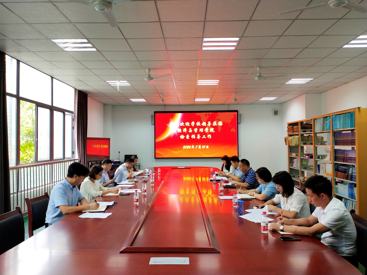 【本网讯】7月10日,上午9:00,学校党委副书记、校长向武教授、副校长毛英教授、科技处处长雷晓蔚教授、教务处副处长袁甲副教授、学生工作部副部长杨友国副教授一行到经管学院调研指导检查指导工作。学院党总支副书记薛国喜同志、副院长李清茂教授及学院教学科研办公室主任王小琴副教授、学生管理办公室副主任曹茂庭、财务会计教育专业教研室主任马久云老师、旅游管理与服务教育专业教研室主任谭志蓉老师参加了此次调研会议。