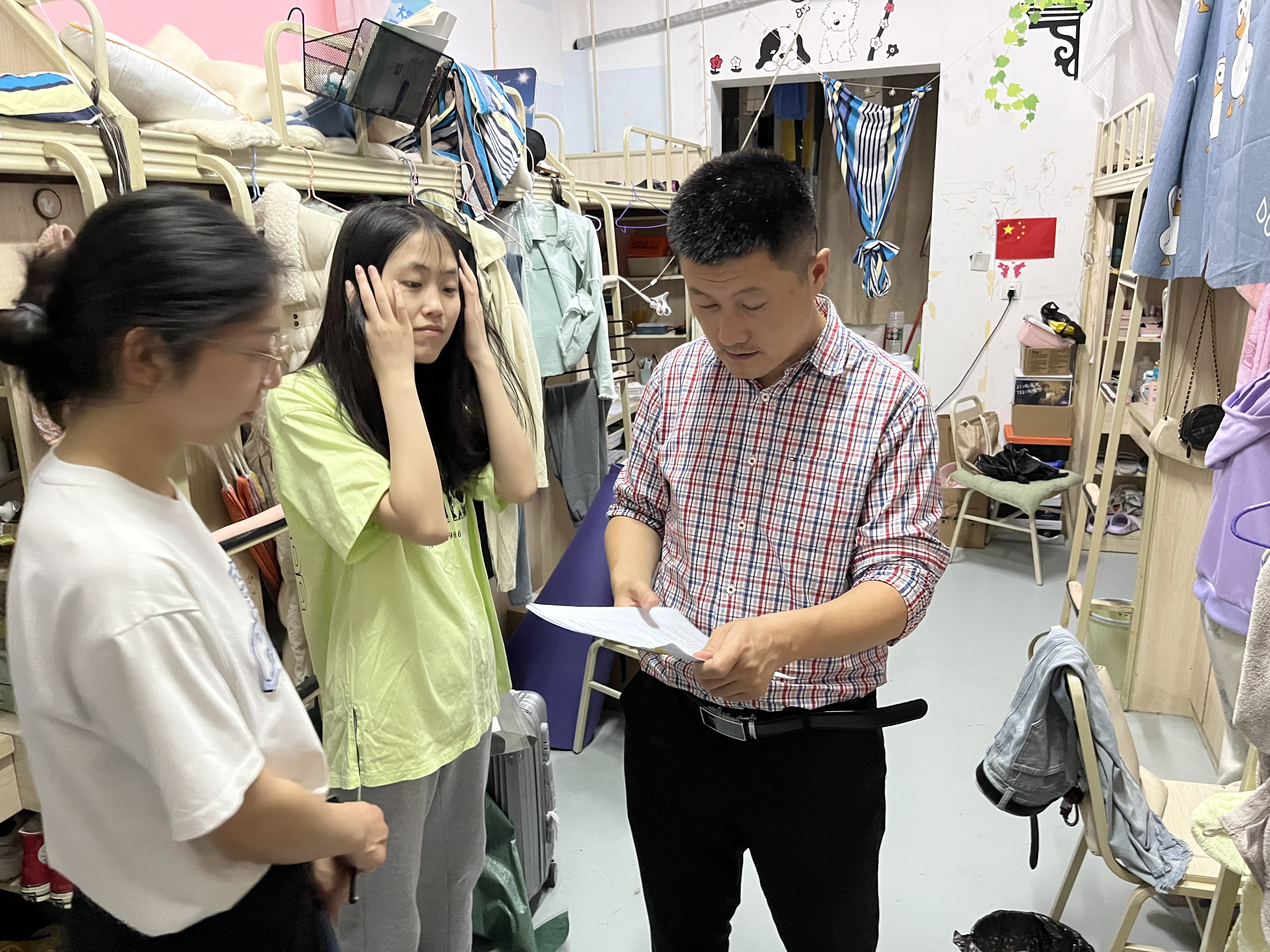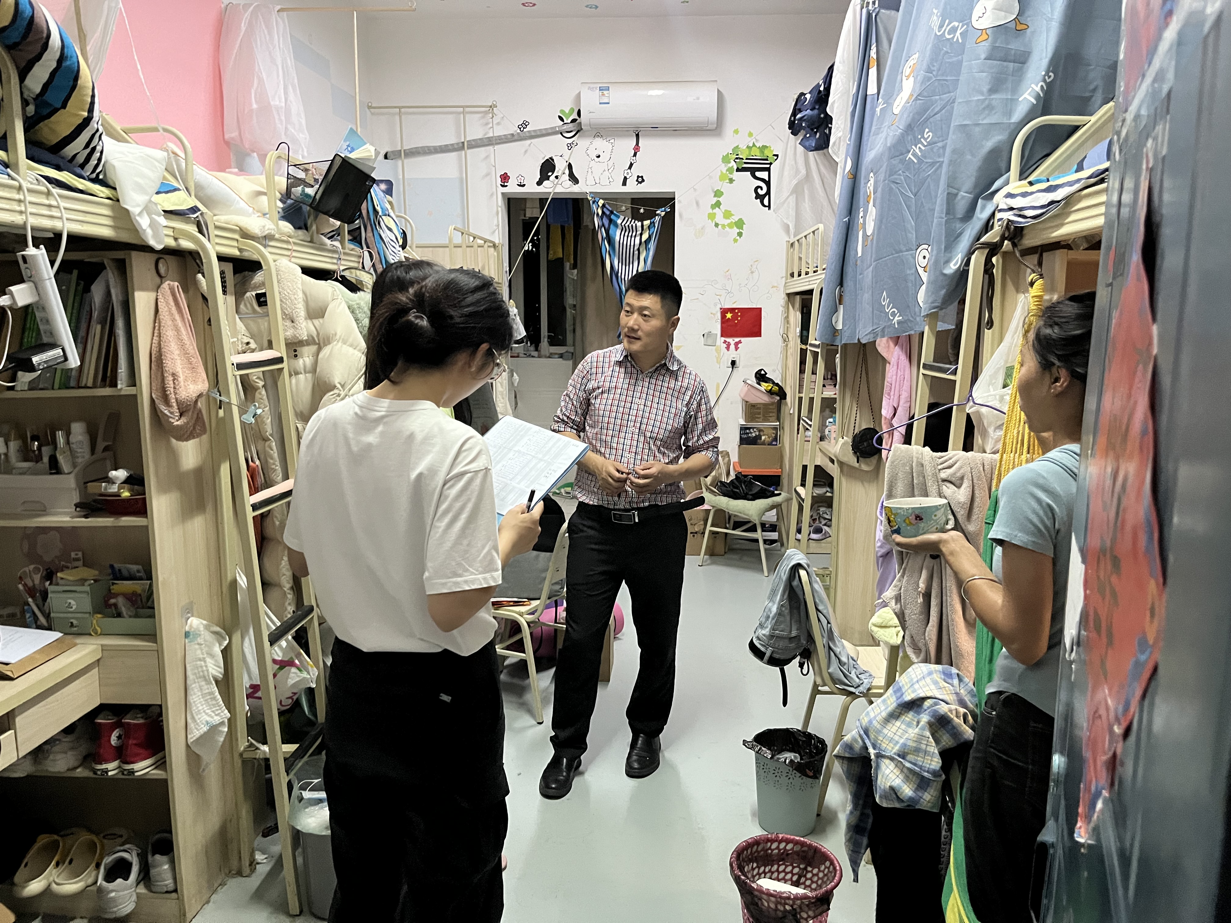 【本网讯】因学校意外停电和电路检修导致学校部分学生寝室供电中断,为了解学生生活中的困难和实际需求,同时排查寝室安全隐患,2022年6月6日晚,经济与管理学院党委书记薛国喜、学生管理办公室主任曹茂庭、辅导员马伟龙至我院学生寝室进行寝室安全走访活动。